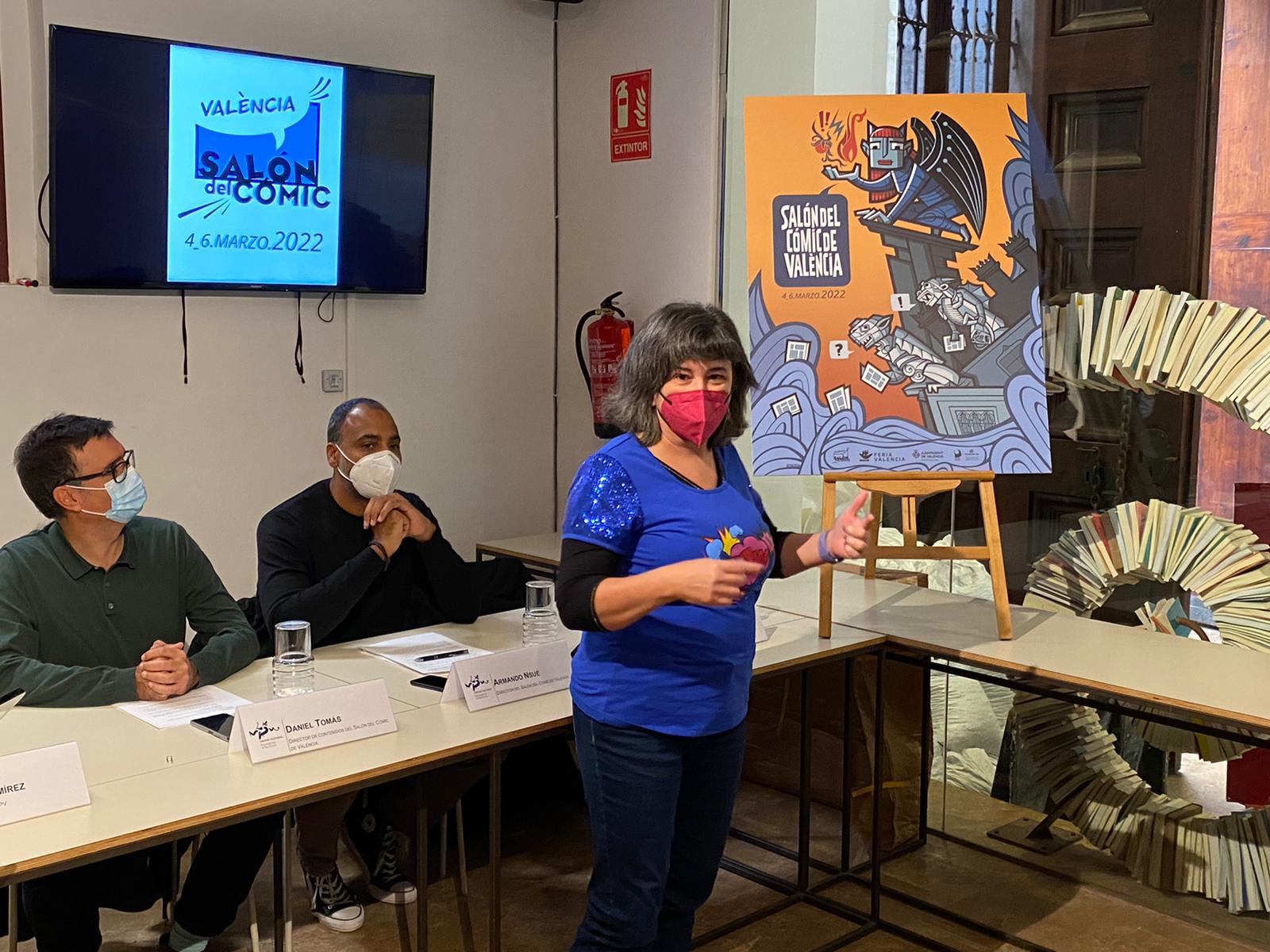 En el acto se dio a conocer el cartel que la autora de cómics valenciana, Premio Nacional de Cómic, Cristina Durán ha realizado, y en el que refleja la esencia del Salón del Cómic con una referencia a la escultura de los Guardianes del Pont del Regne de la ciudad de València –“que la hemos convertido en guardiana”, apuntó Durán- así como las gárgolas de la histórica Lonja de València, “elementos mediterráneos que junto al mar o el color naranja nos acercan el Salón a València”, explicó la ilustradora.